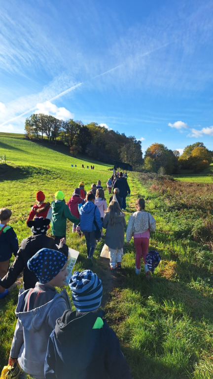 Am Donnerstag, den 30.10.25 machten die Jahrgänge 1 und 2 bei herrlichstem Wetter einen kleinen Spaziergang und konnten unterwegs tatsächlich ein paar Äpfel finden.